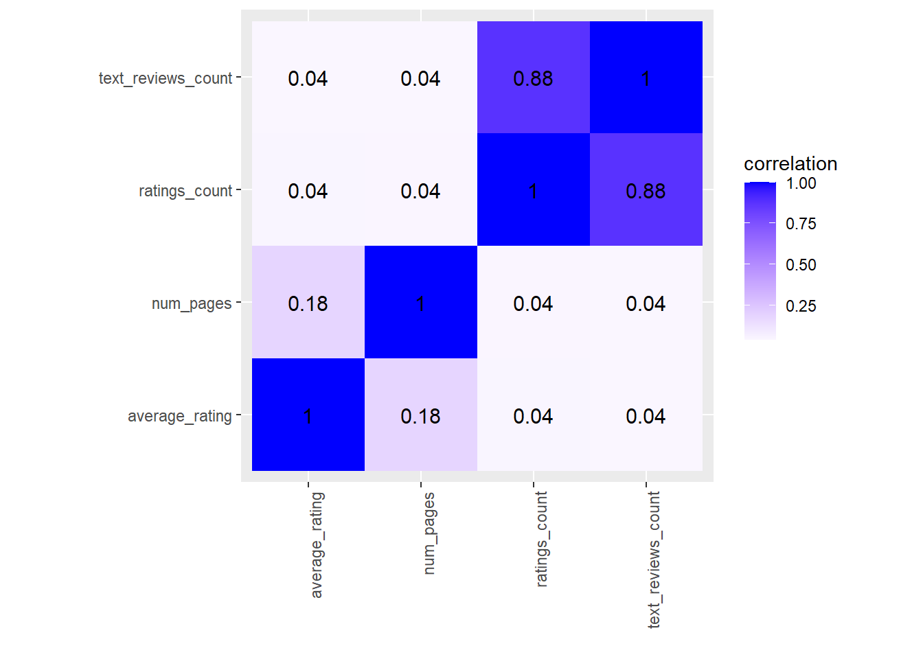 I have always loved reading, so I thought may not use R and data science to help me decided which book I should read next! After poking around on Kaggle, I have found two datasets containing a myraid of information on many titles. The first dataset by Soumik originated from him scraping the GoodReads API using ISBNs and contains the variables ‘bookID’ (a unique integer associated with each book), ‘title’, ‘authors’, ‘average rating’ (0-5 scale), ‘isbn’, ‘isbn13’, ‘langauge code’ (eng or other languages), ‘num_pages’, ‘ratings_count’ (total number of ratings), ‘text_reviews_count’ (total number of written text reviews). Out of these variables, ‘ratings_count’ and ‘average_rating’s is highly associated, since the latter is simply the mean of the total ratings score divided by the former. However, we wish to compare average ratings so that book suggestions will not be biased by the number of ratings. Furthermore, I would expect ’ratings_count’ and ‘text_review_count’ to be highly correlated, since if a book has many ratings, which means that it must be somewhat popular (or notorious), so the said book probably also has many written critic ratings.