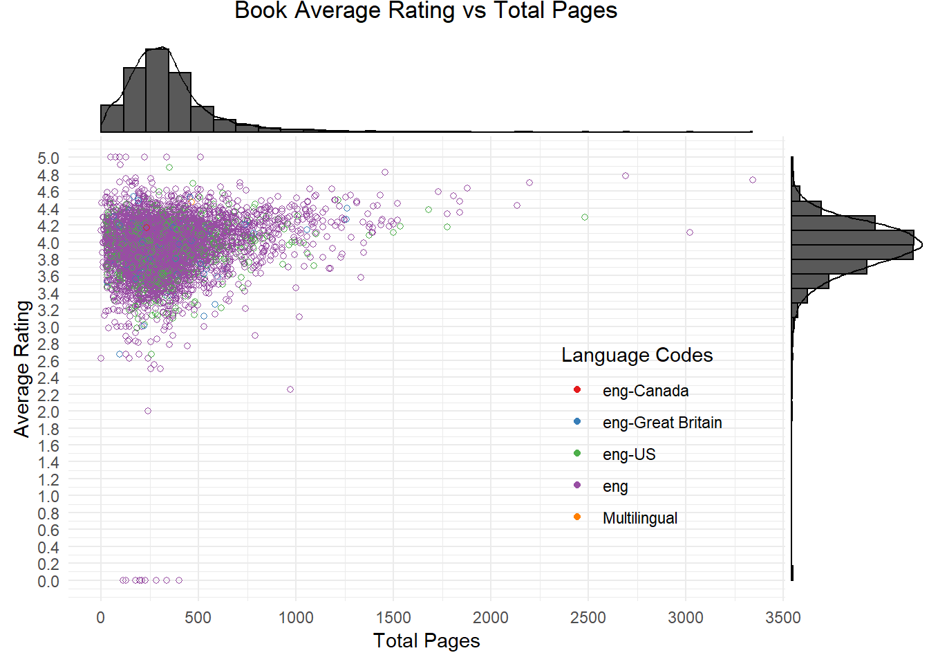 The marginal distribution of novel average ratings is roughly normal (symmetric) with mean around rating 4.0, which implies that on average the books in this merged dataset have a relatively high rating (they are good books!). The marginal distribution of total number of pages of the novels is right skewed with mean around 300 pages, which makes sense given that books (except textbooks, especially novels) are typically short and do not go over 1000 pages. This scatterplot does not indicate an apparent relationship between average_rating and total pages, which also makes sense since quantity does not imply quality. When colorized by language codes, we see that almost all books are in English (especially the longer ones, since the effort to translate said books would be monumental) with each sub-category consisting of largely variant book ratings with no significant patterns.