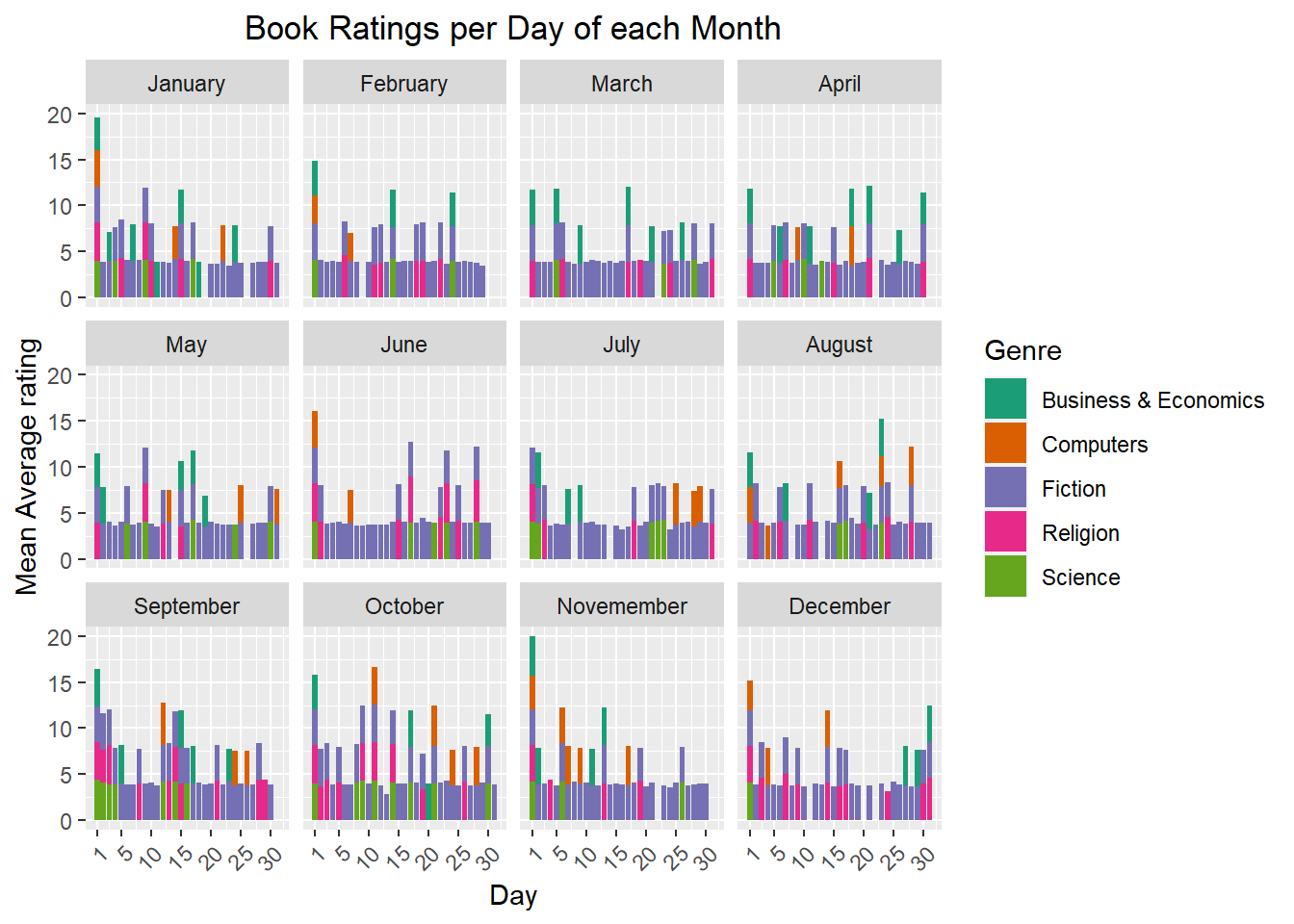 Based on the categories of books we have selected, it appears that authors like to release these genre books at the first day of each month (most likely to maximize the first monthly sales possible), given that we have the most number of stacked bars at usually day 1 of each month except August (which happens to be around the time of school starting in the fall). For our dataset, the purple colored bars appears most often, meaning that fiction is the most popular category of novels given that it’s published the most. Across each month and day, the mean average_rating of each genre appears roughly similar, which makes sense which the quality of a particular novel category should have no relation with respect to the title’s publication date. The frequency of each category also remains relative constant throughout each month and day, with the exception of March which curiously have no computer publications.