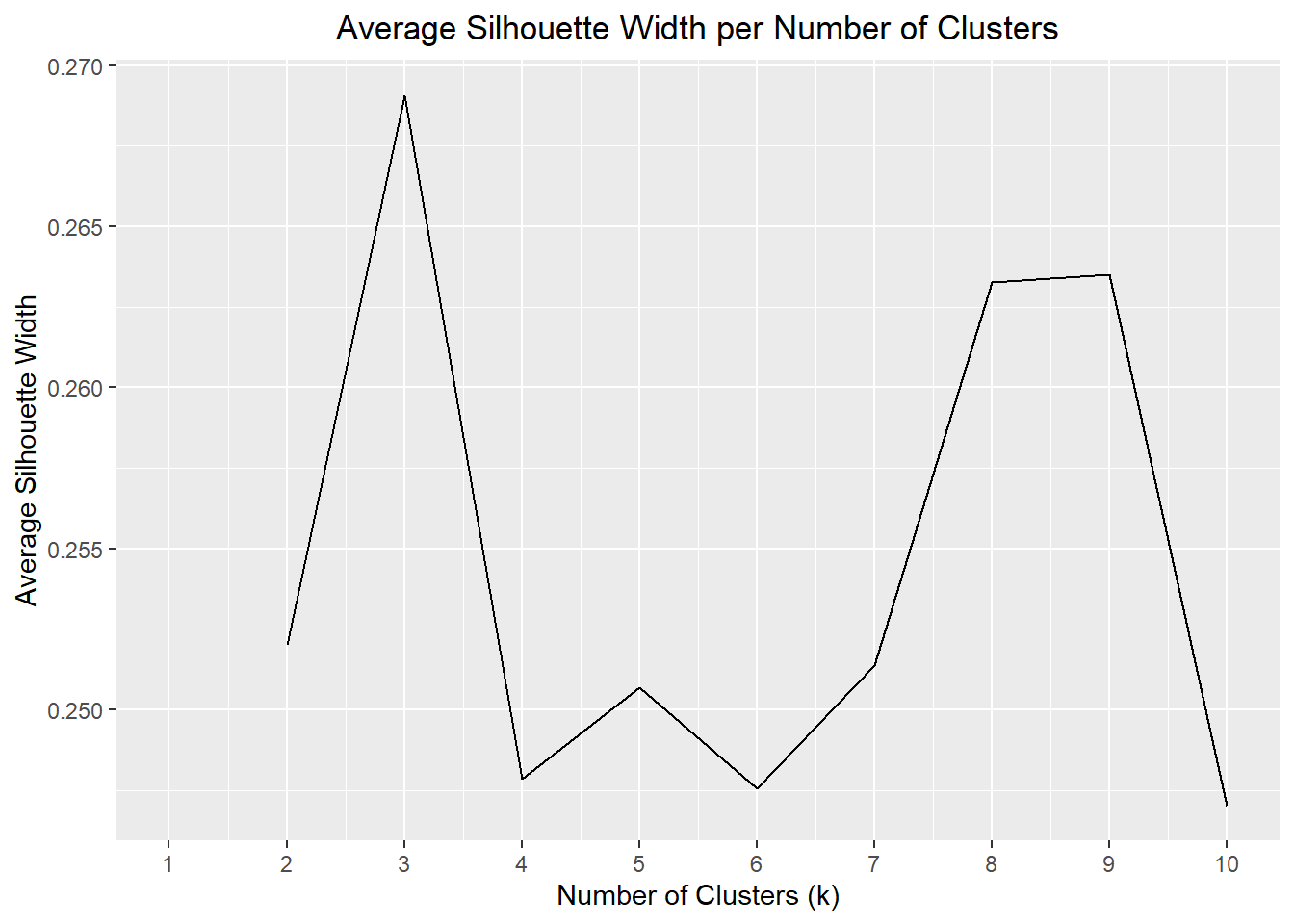 breaks = 1:10) + labs(title = "Average Silhouette Width per Number of Clusters",