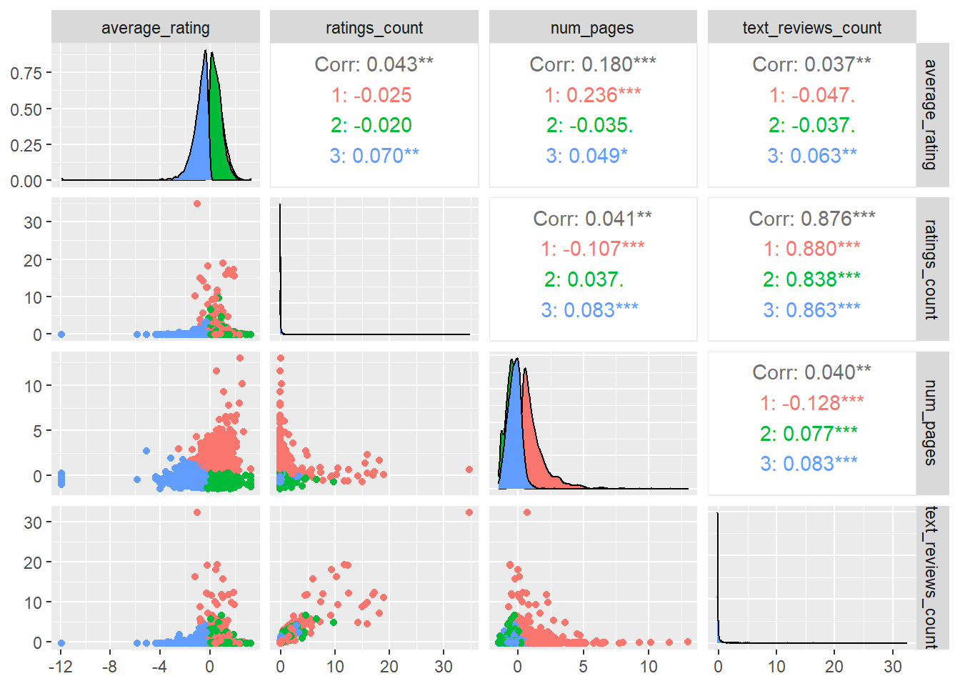 For the first column, particularly the num_pages vs average_rating scatterplot, we see three distinct clusters where the red clusters seems to consist of titles with relatively large number of pages, while the blue and green clusters separate out titles with low page numbers but with low and high average_ratings respectively (at z=0, or the overall mean). The same trend is also found in other graphs, where the blue clusters mainly consist of low-rated, small books, while the red cluster consist of large books and the green cluster highly-rated, small books. The clusters seems to overlap relative to variables like text_reviews_count and reviews_count which is highly correlated with each other and thus hard to differentiate.