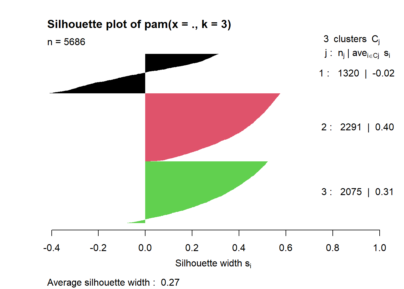 Based on this silhouette width plot, we see that we should elect three clusters since that’s the number of clusters that results in the highest average silhouette width, which means that our 3 supposed clusters should be more cohesive, distinct, and parsimonious compared to other number of clusters.